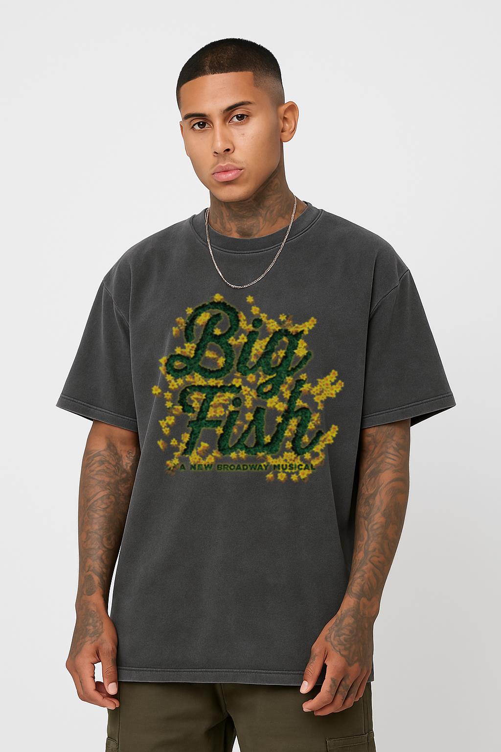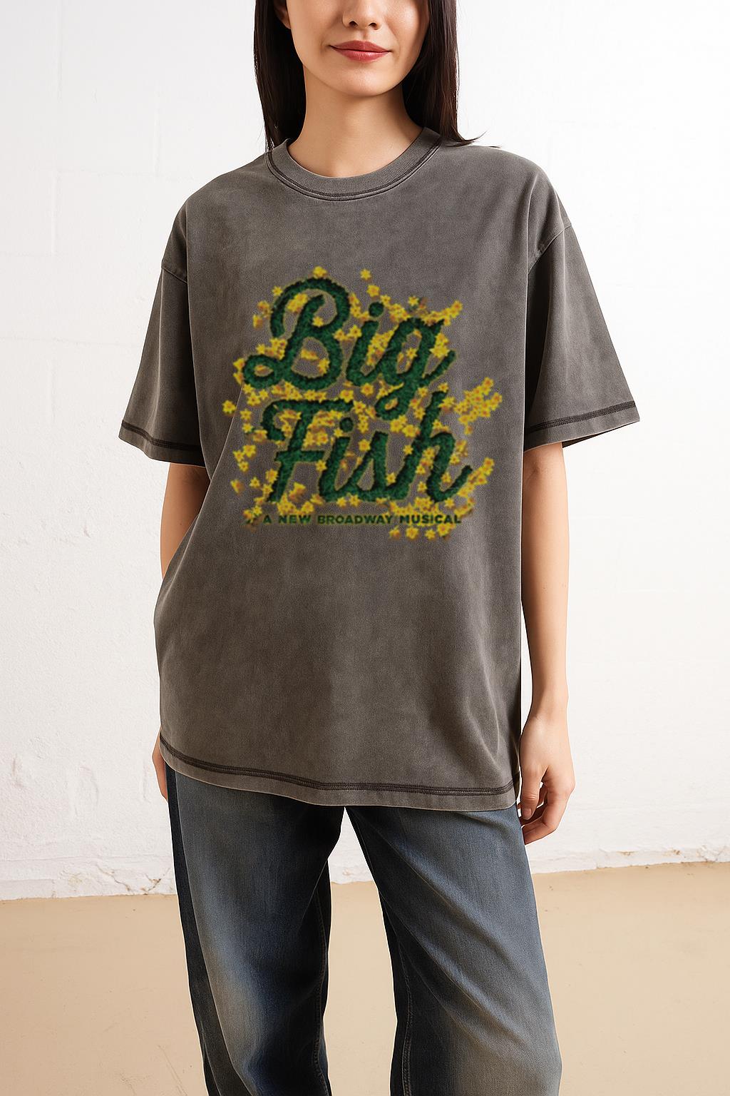Immerse yourself in the enchanting world of Broadway with this **Big Fish The Musical T-shirt**, a perfect tribute to the heartwarming stage show. This graphic tee, ideal for musical theater fans, is crafted from 100% cotton with a unique black acidwash finish. With its regular fit, dropped shoulders, and ribbed crewneck, it offers both comfort and a stylish way to showcase your love for the fantastical story of Edward Bloom and his extraordinary adventures.