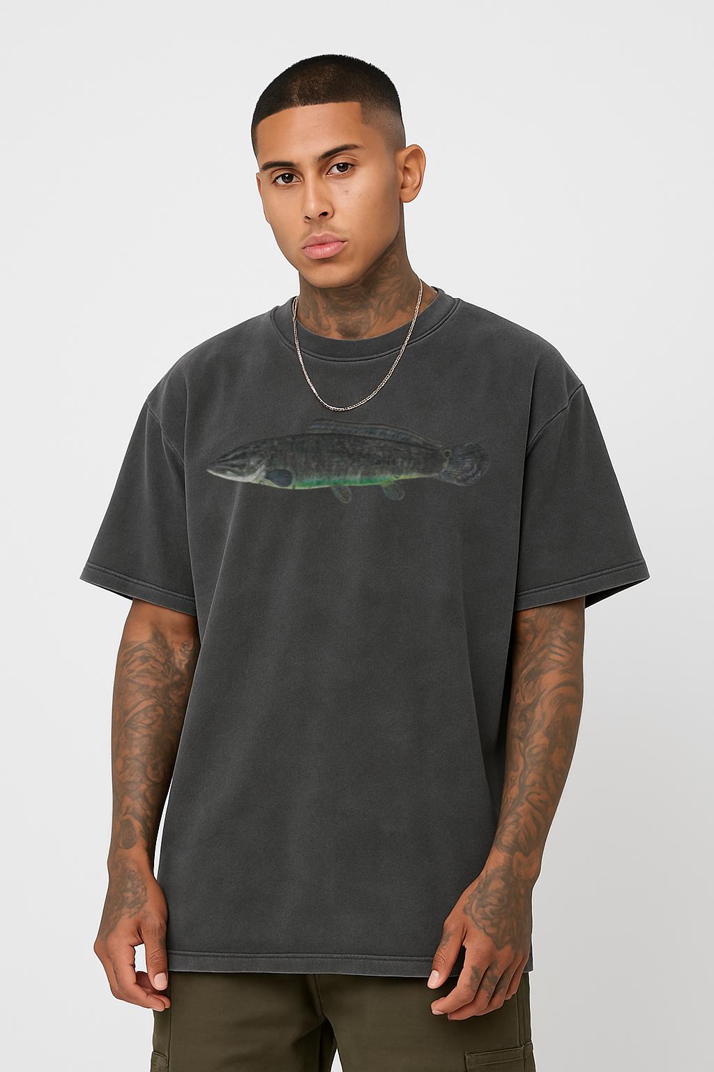 Celebrate the fascinating Bowfin (Amia calva), a true living fossil, with this distinctive graphic T-shirt. Perfect for anglers, ichthyology enthusiasts, and nature lovers, this 100% cotton tee features a detailed Bowfin illustration on a trendy black acidwash background. Its comfortable regular fit makes it ideal for your next fishing trip or casual wear.
