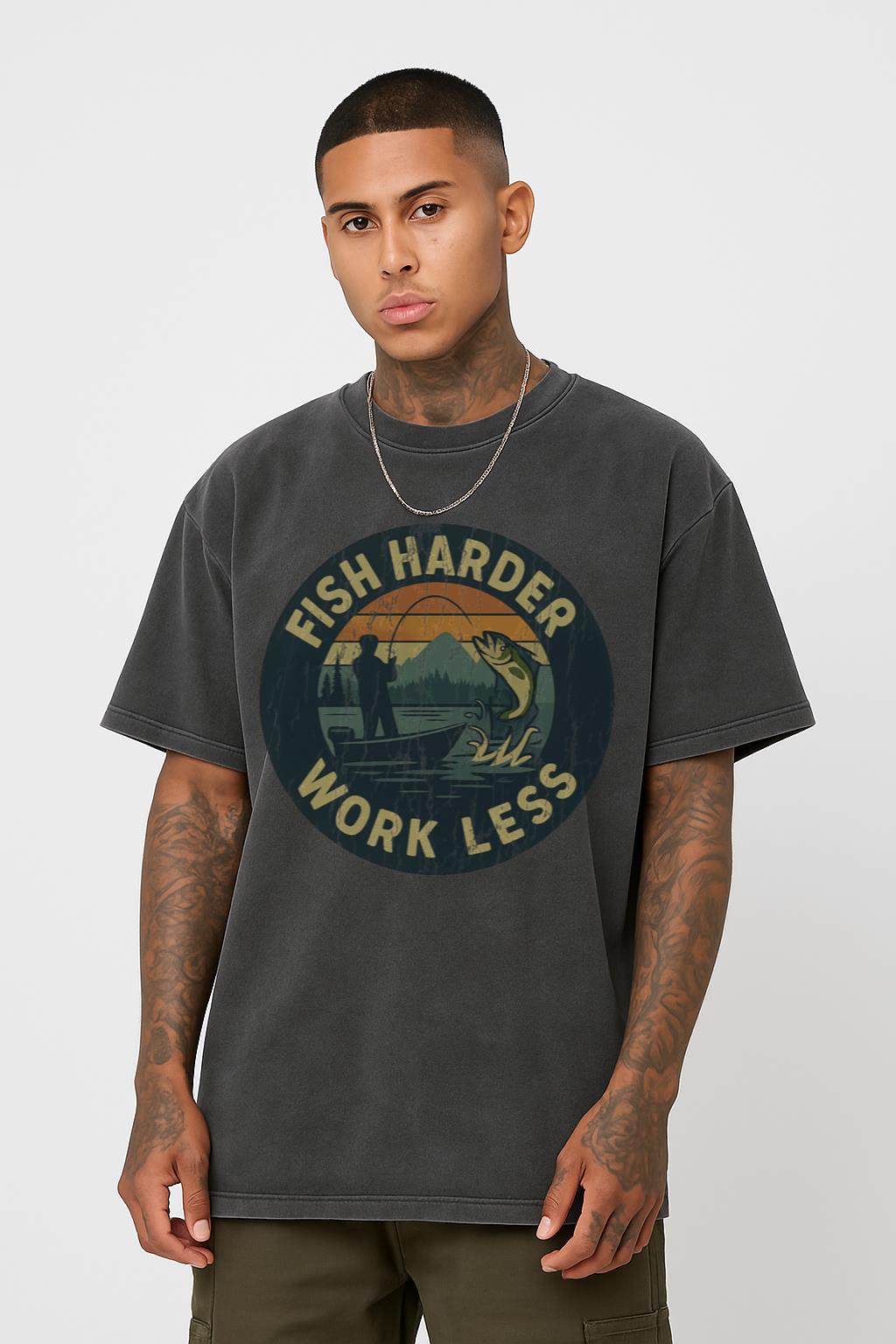 Embrace the angler’s motto with this **”Fish Harder Work Less” T-Shirt**, a humorous design perfect for anyone who’d rather be on the water. Ideal for fishing enthusiasts, outdoor lovers, and anyone needing a good laugh, this graphic tee is made from 100% heavyweight cotton in a cool black acidwash. Its regular fit and dropped shoulders ensure comfort, making it a great gift or a staple for your next fishing trip.