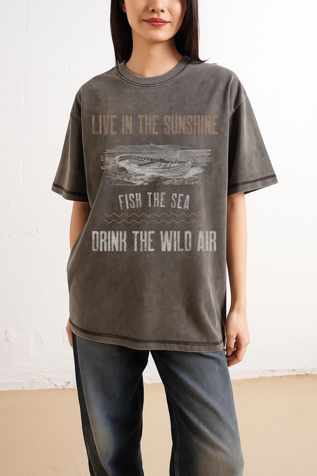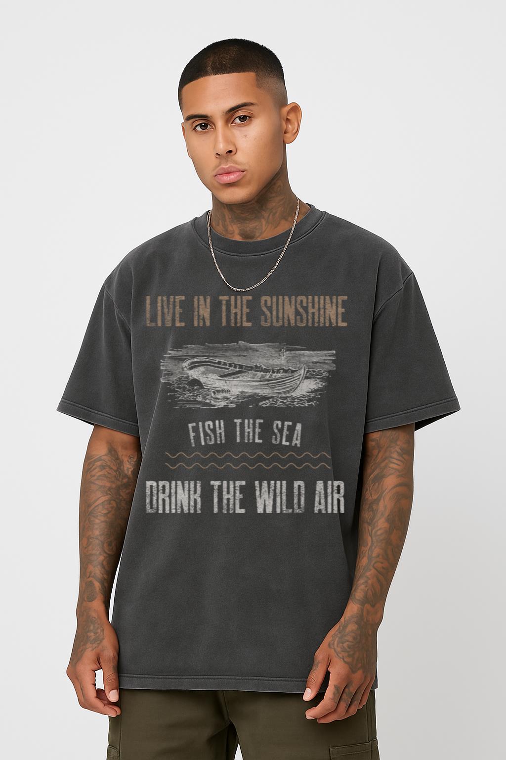 Embrace the tranquil joy of the outdoors with this “Live in the Sunshine” Fishing Rowboat T-Shirt, perfect for any angler or nature lover. Crafted from 100% cotton with a unique black acidwash, this regular fit tee features a serene rowboat graphic, making it ideal for your next fishing adventure.