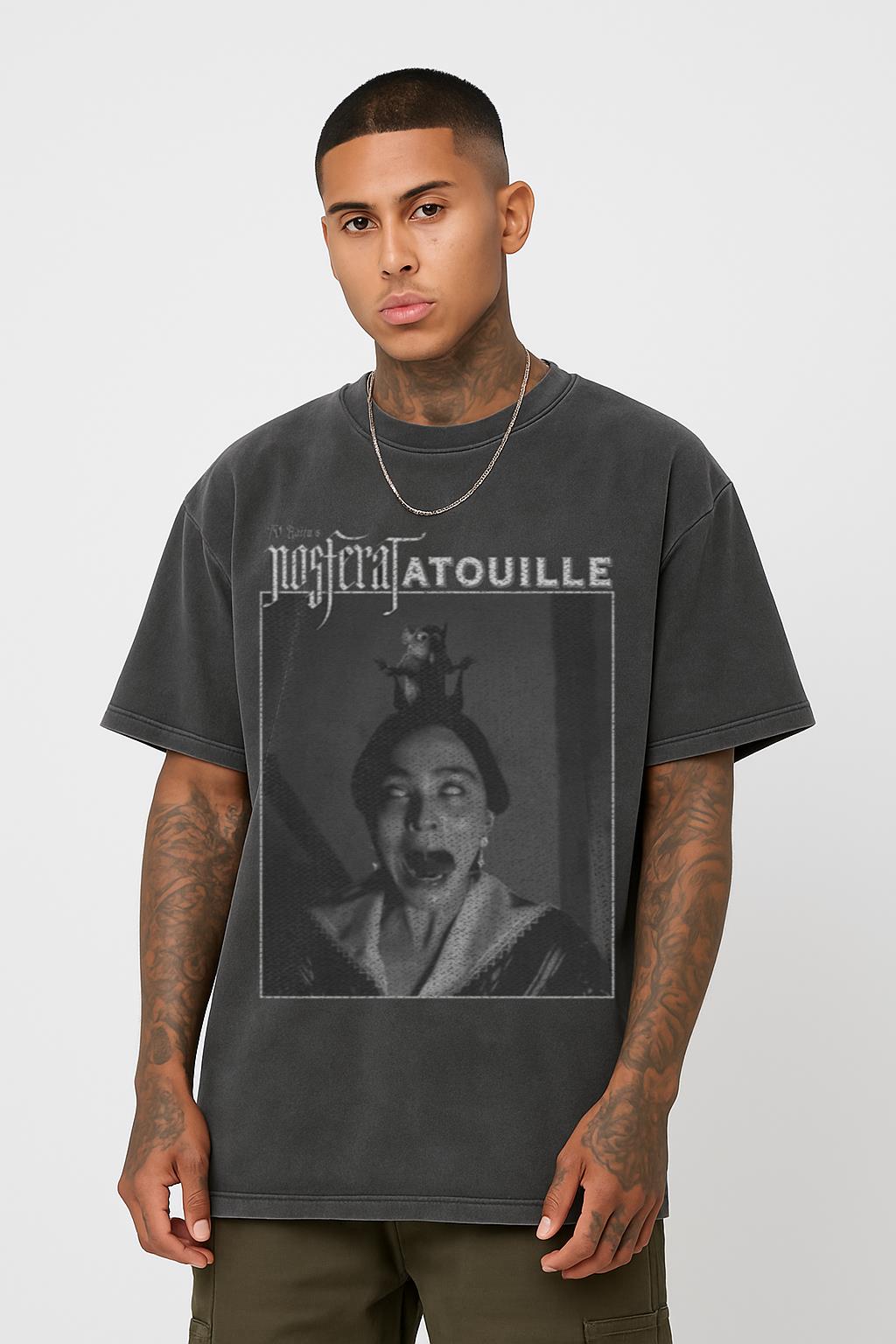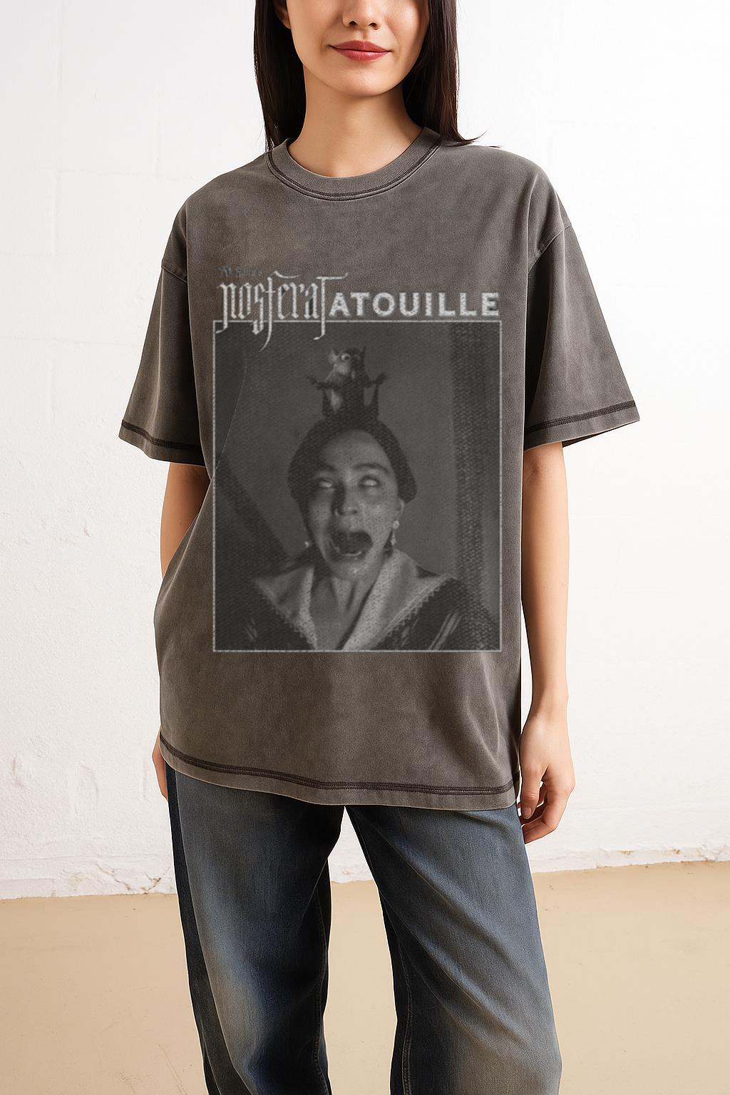 Sink your teeth into this darkly humorous **Nosferatatouille T-Shirt**, a brilliant movie mashup of Nosferatu and Ratatouille. This **100% cotton acidwash tee** features a unique fan-created graphic of a vampire rat chef, blending horror parody with spooky cooking. It’s the perfect graphic tee for fans of dark comedy, cult classics, and unique culinary art.
