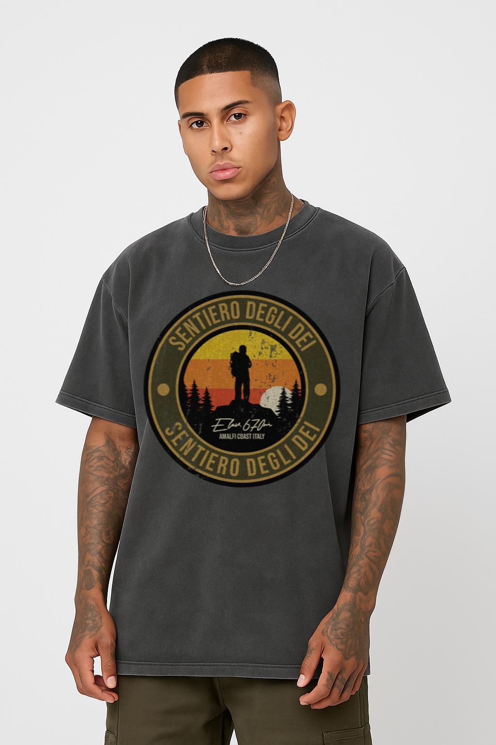 Capture the breathtaking beauty of Italy’s famous ‘Path of the Gods’ with this inspiring Sentiero degli Dei T-Shirt. Crafted from 100% cotton with a unique black acidwash finish, this graphic tee features a ribbed crewneck, regular fit, and dropped shoulders for a relaxed, comfortable feel. It’s the ideal way to remember your Italian adventures or dream of future treks through the stunning **Amalfi Coast** mountains.