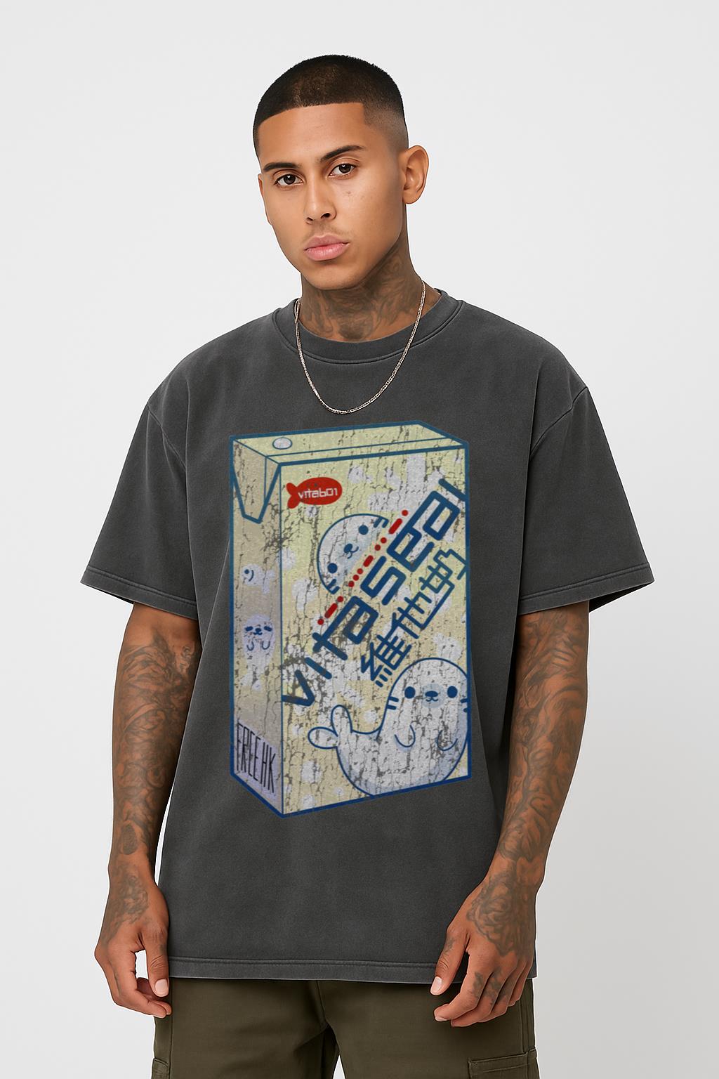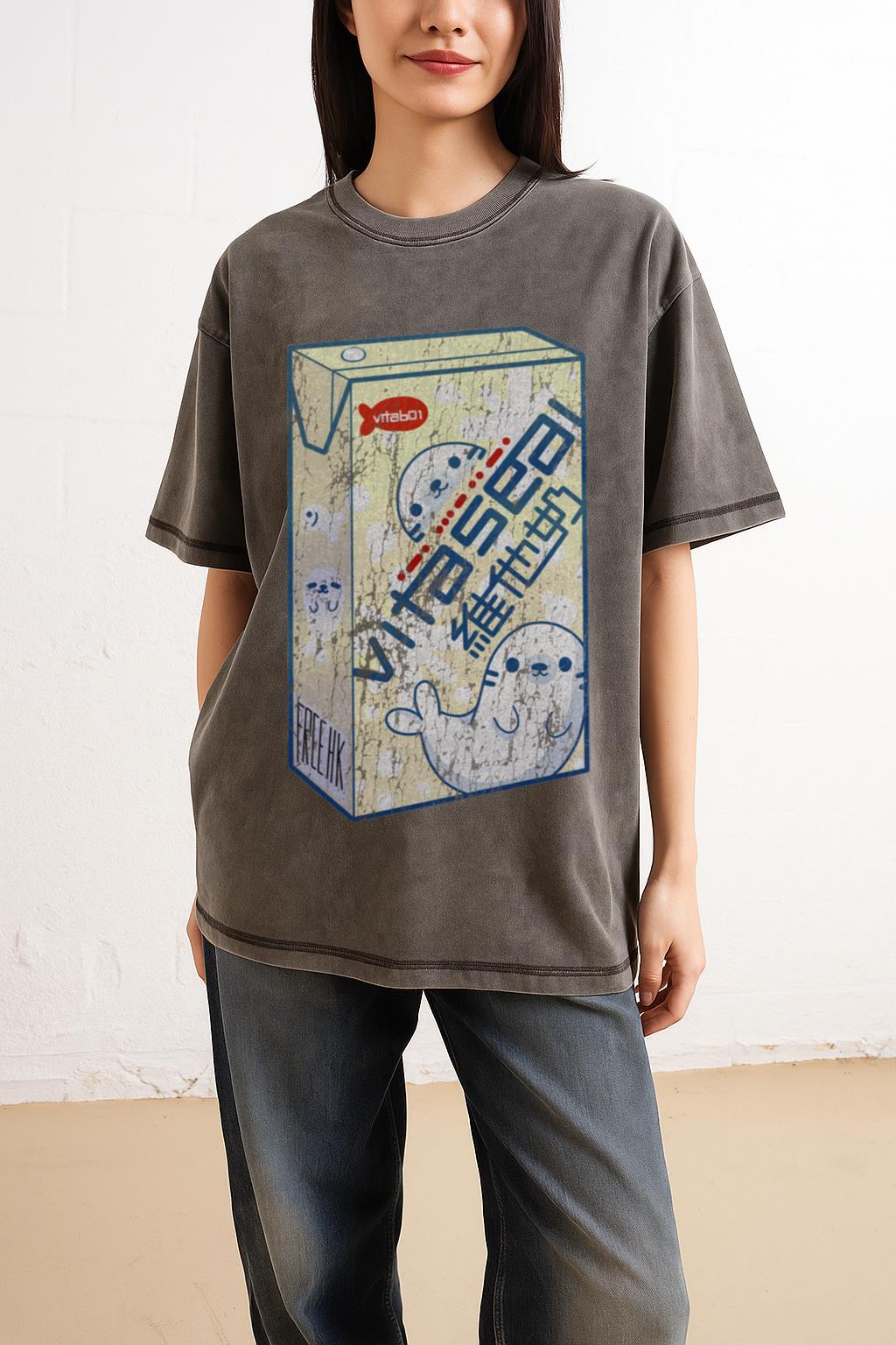 Indulge in some nostalgic Hong Kong charm with this **VitaSeal Soymilk T-shirt**, a playful **Vitasoy parody** featuring an adorable seal pup. This unique design captures the essence of a beloved Asian drink, perfect for foodies and fans of quirky graphics. Made from **100% cotton** with a distinctive **black acidwash** finish, this regular fit tee with dropped shoulders offers comfort and a fun, retro aesthetic, making it a delightful **funny Asian drink tee** and a great conversation starter.